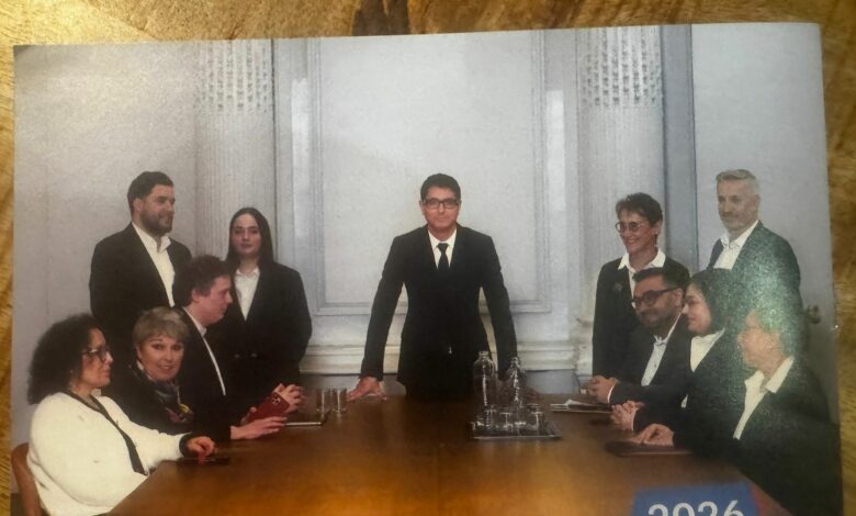 Je viens de recevoir le tract. Avant même de lire le programme, je me suis arrêté sur la photo. Et là, franchement, tout est déjà dit. Grande table en bois massif, lignes droites impeccables, perspective parfaitement alignée. La composition est millimétrée. Lui est debout, au centre exact du cadre, les mains posées à plat, regard …
